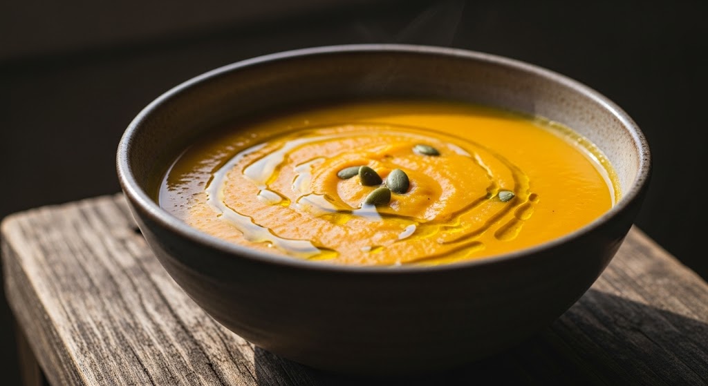 Een scheutje extra vierge olijfolie over een kom pompoensoep voegt rijkdom toe. Gebruik Koroneiki-olie in de herfst voor een nootachtige diepte. Voeg vlak voor serveren toe.
